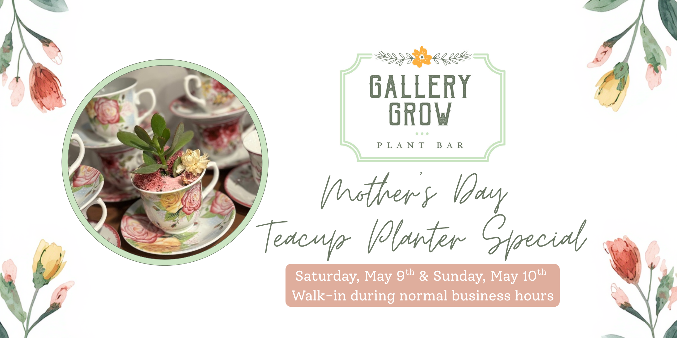 Stop in anytime during our normal business hours on Saturday, May 9th (10am-6pm) & Sunday, May 10th (12-4pm) to create a Mother’s Day teacup planter—perfect for your mother or a special mother figure in your life, or to enjoy making together. Limited-time price of just $15 per project (regularly $20).